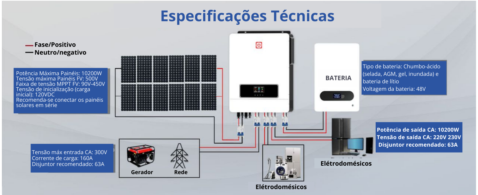Este é um inversor/carregador multifuncional, combinando funções de inversor, carregador solar e carregador de bateria para oferecer suporte de energia ininterrupta em tamanho portátil.